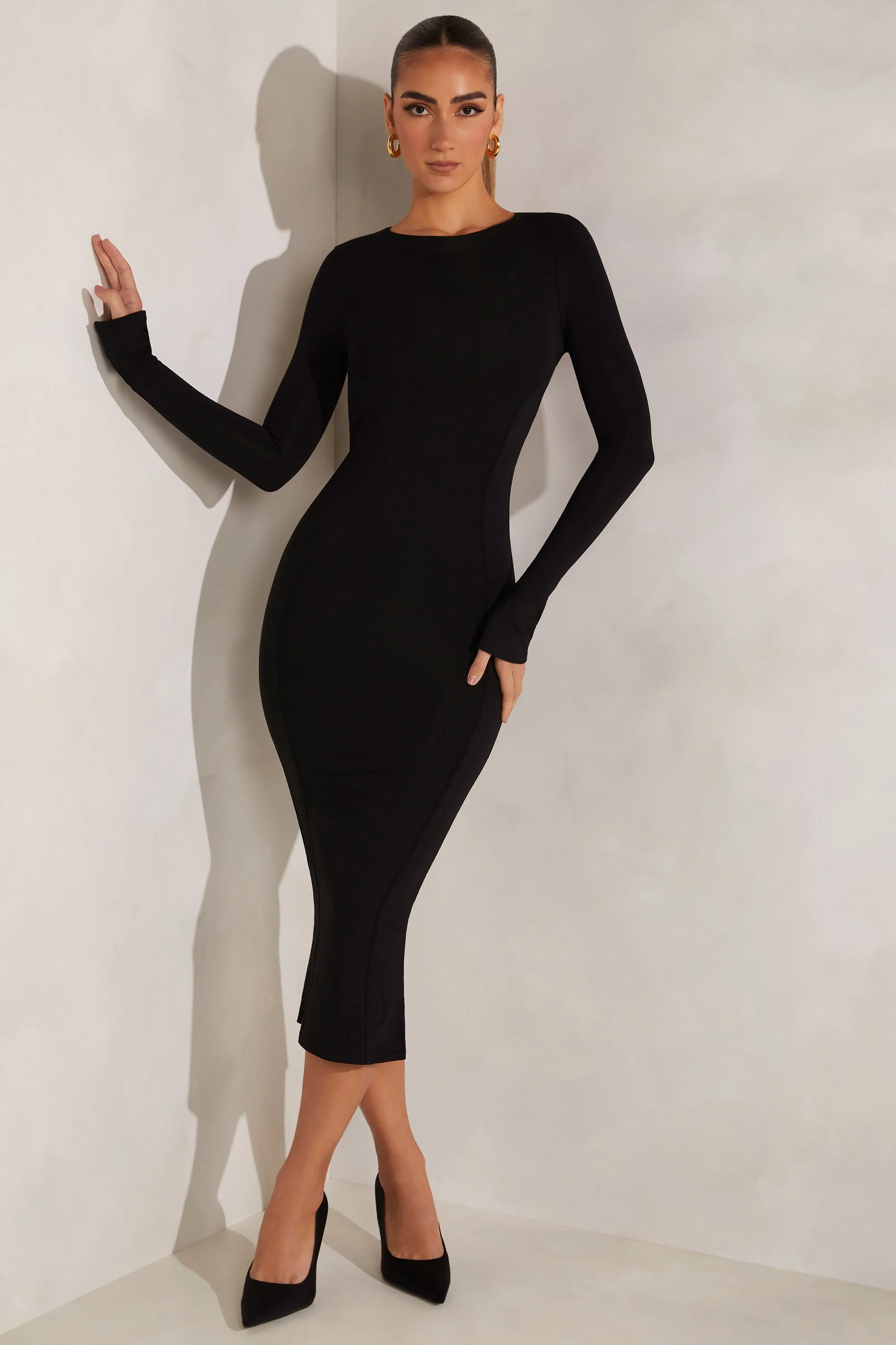 High Neck Long Sleeve Open Back Midaxi Dress in Black
