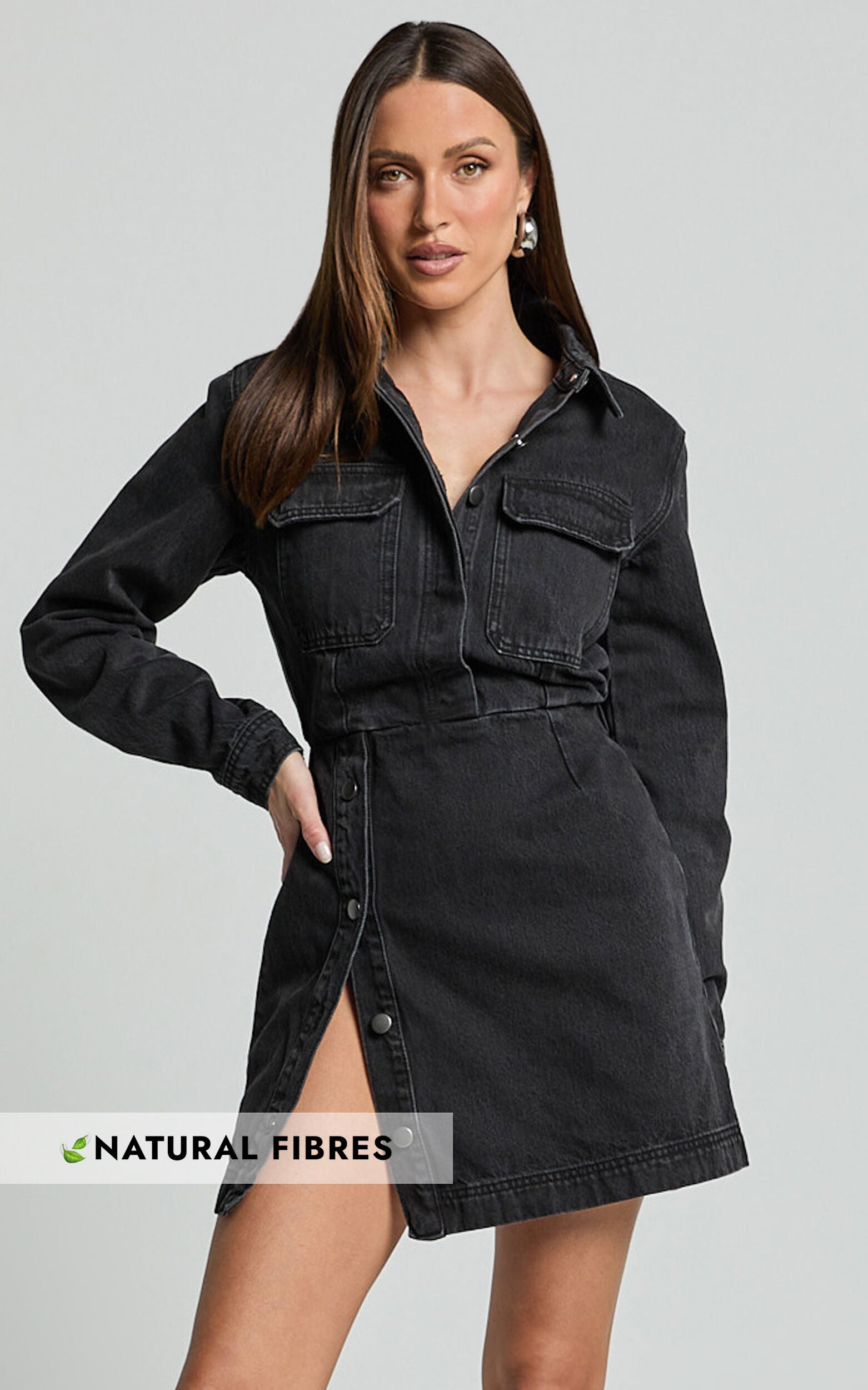 Elevate your wardrobe with the Ainsley Mini Dress, the ultimate fusion of utility chic and casual elegance. This long sleeve denim dress, featured in an effortlessly cool washed black, is the epitome of fashion-forward dressing for the Gen Z and Millennial crowd. Crafted from recycled cotton, it's not just about looking good, but also feeling good about your impact on the environment.